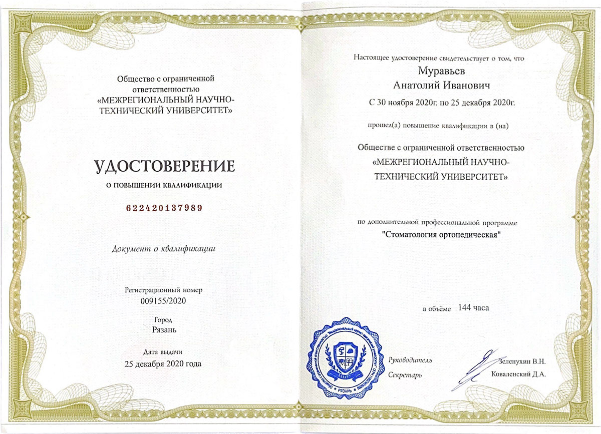 О повышение квалификации по программе «Стоматология ортопедическая» от 25.12.2020г.