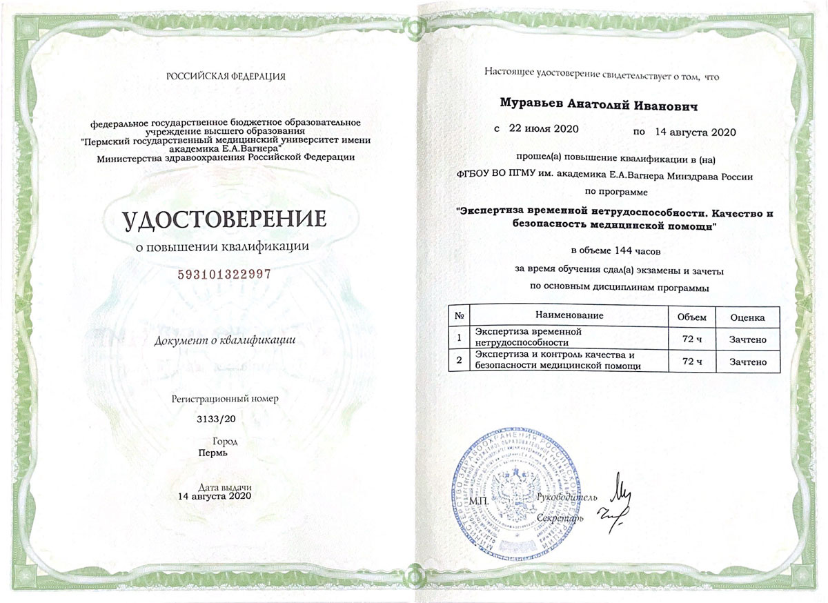 О повышение квалификации по программе «Экспертиза временной нетрудоспособности. Качество и безопасность медицинской помощи от 14.08.2020» от 25.12.2020г.